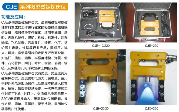 CJE系列微型磁軛探傷儀有交流、直流、交直流兩用磁粉探傷儀,直流供電電源為可充電池,適用于野外無電源現(xiàn)場(chǎng)操作以及高壓不能進(jìn)入的容器、橋梁、管道等現(xiàn)場(chǎng)操作,一次充電連續(xù)工作時(shí)間可達(dá)6小時(shí)以上。交流供電電源采用220V電源直接輸入,無需其他儀器配套,操作方便、簡(jiǎn)單、重量輕、便于攜帶,因而該儀器得到廣泛使用。